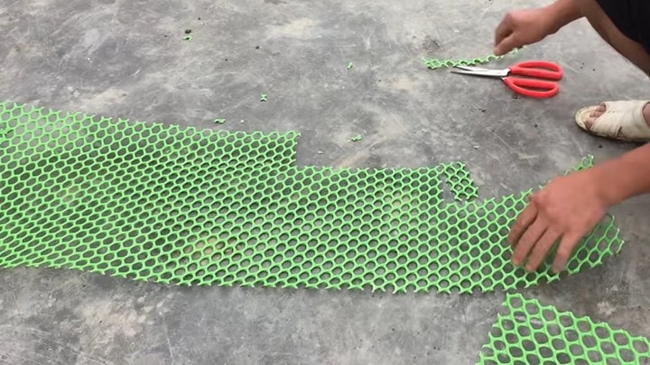 Первый шаг — подготовьте длинный кусок жесткой сетки. Обрежьте его по форме лесенки, чтобы создать основу для вашей клумбы.